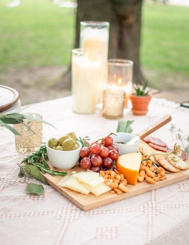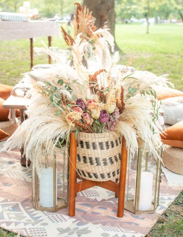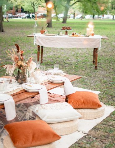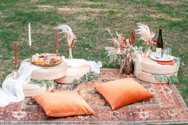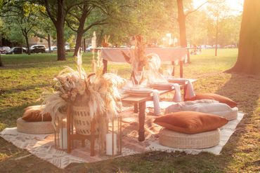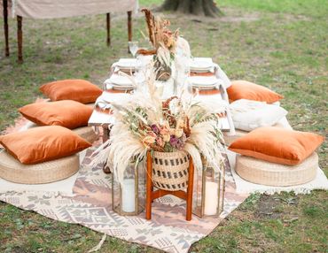 Includes: 3 hours of Picnic Tables, Pillows or Wicker Poofs, Rugs, Votives, Napkins, Plates, Glasses, Silverware, Bluetooth Speaker, 1 Small Dried Floral Arrangement and 1 Large Dried Floral Arrangement.